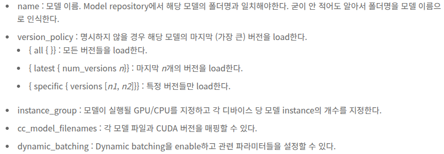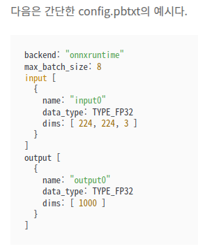 config.pdtxt 파일에 작성, 필수 옵션 = backend, max_batch_size, input, output